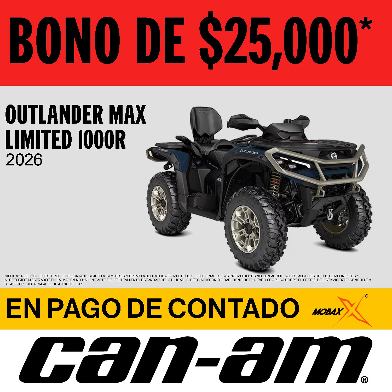 Obtén un bono de $25,000* en pago de contado para comprar tu Can-Am Outlander MAX Limited 1000R 2026.